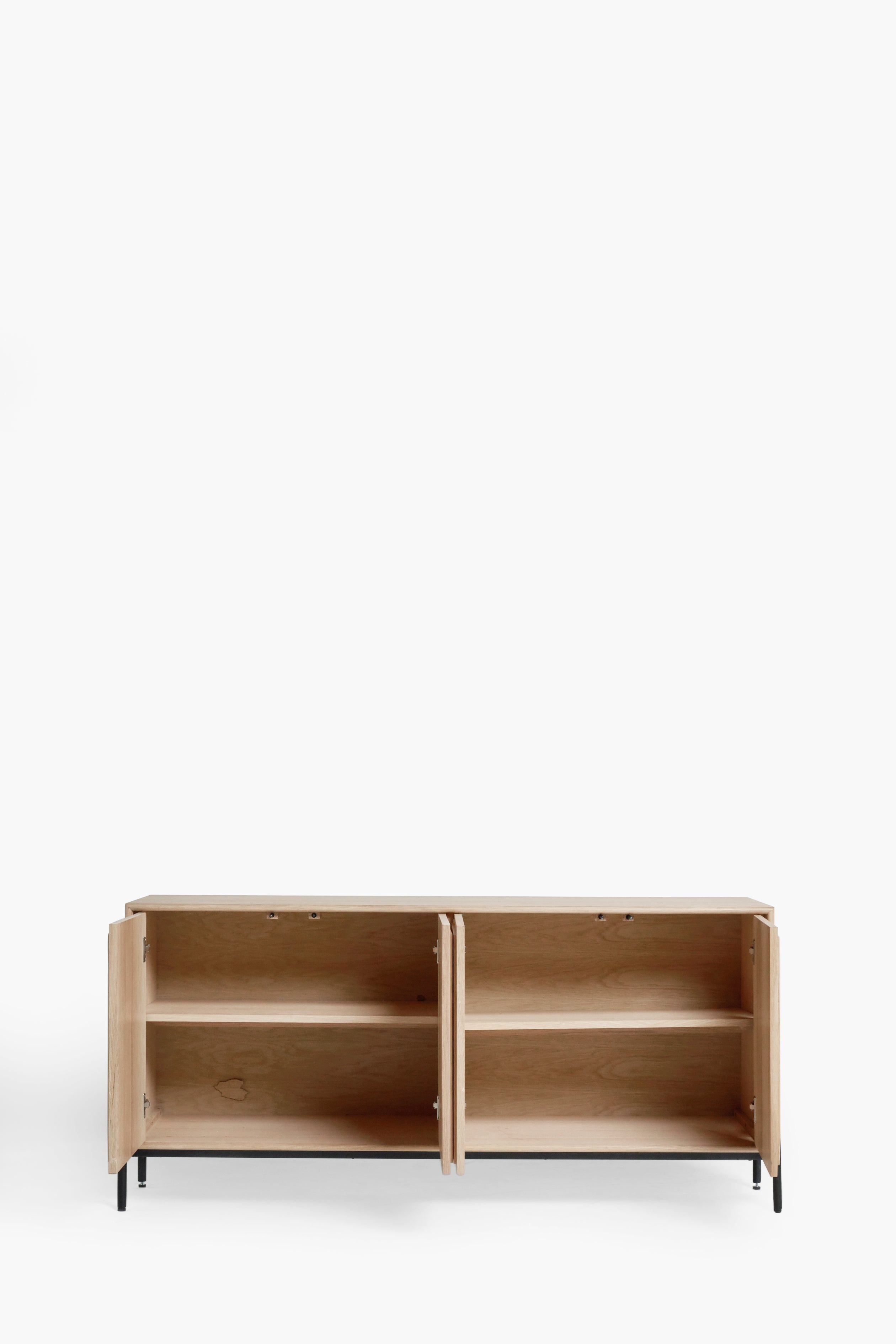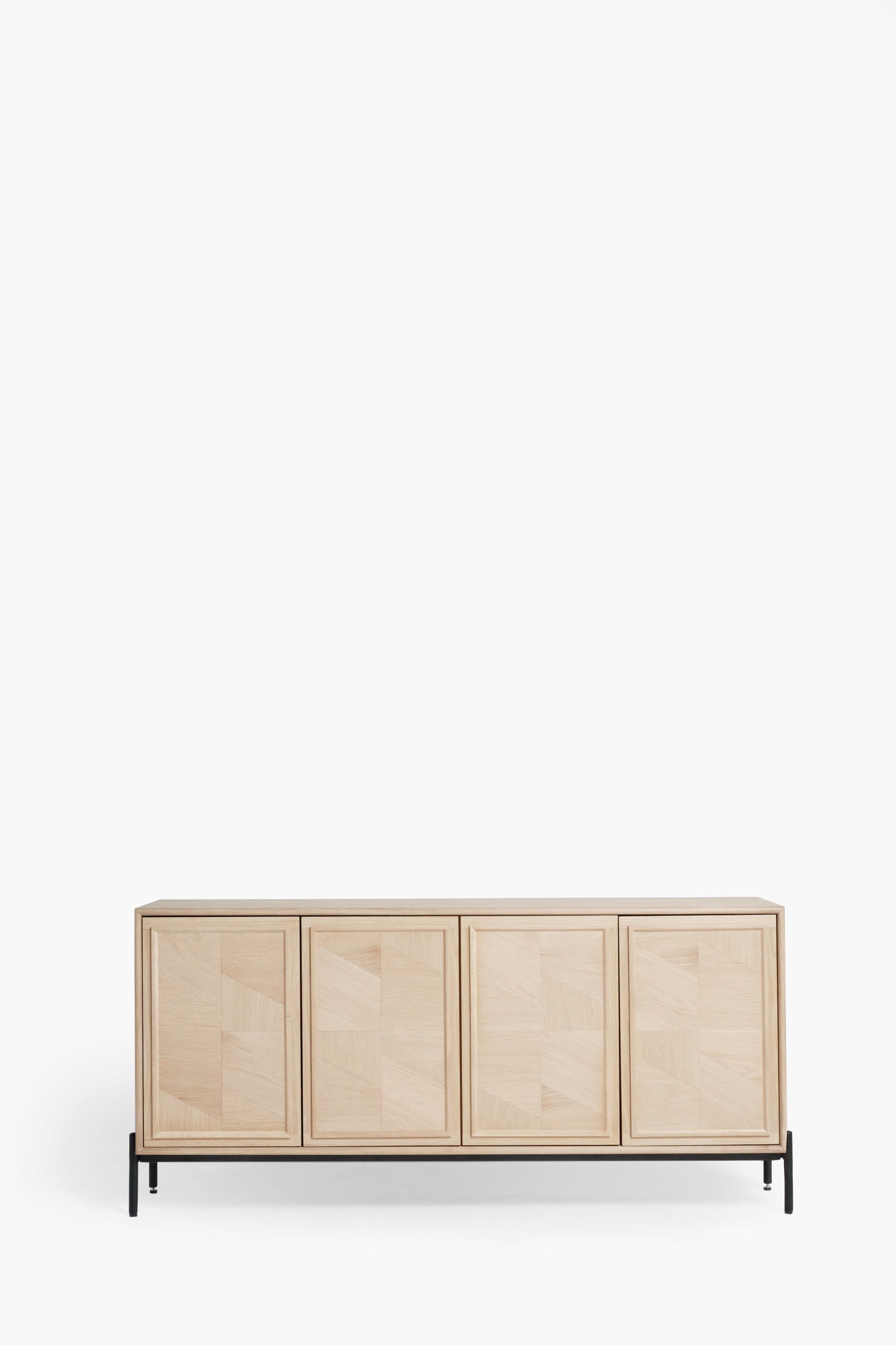 The clean lines and sleek silhouette are enhanced by a striking black metal frame, providing a contemporary contrast to the neutral white washed oak finish. The Aden sideboard boasts a push-to-open function, ensuring a seamless and handle-free aesthetic. Complete your interior design vision by exploring the rest of the Aden collection, also available in a beautiful dark oak finish, allowing you to curate a cohesive and stylish home.