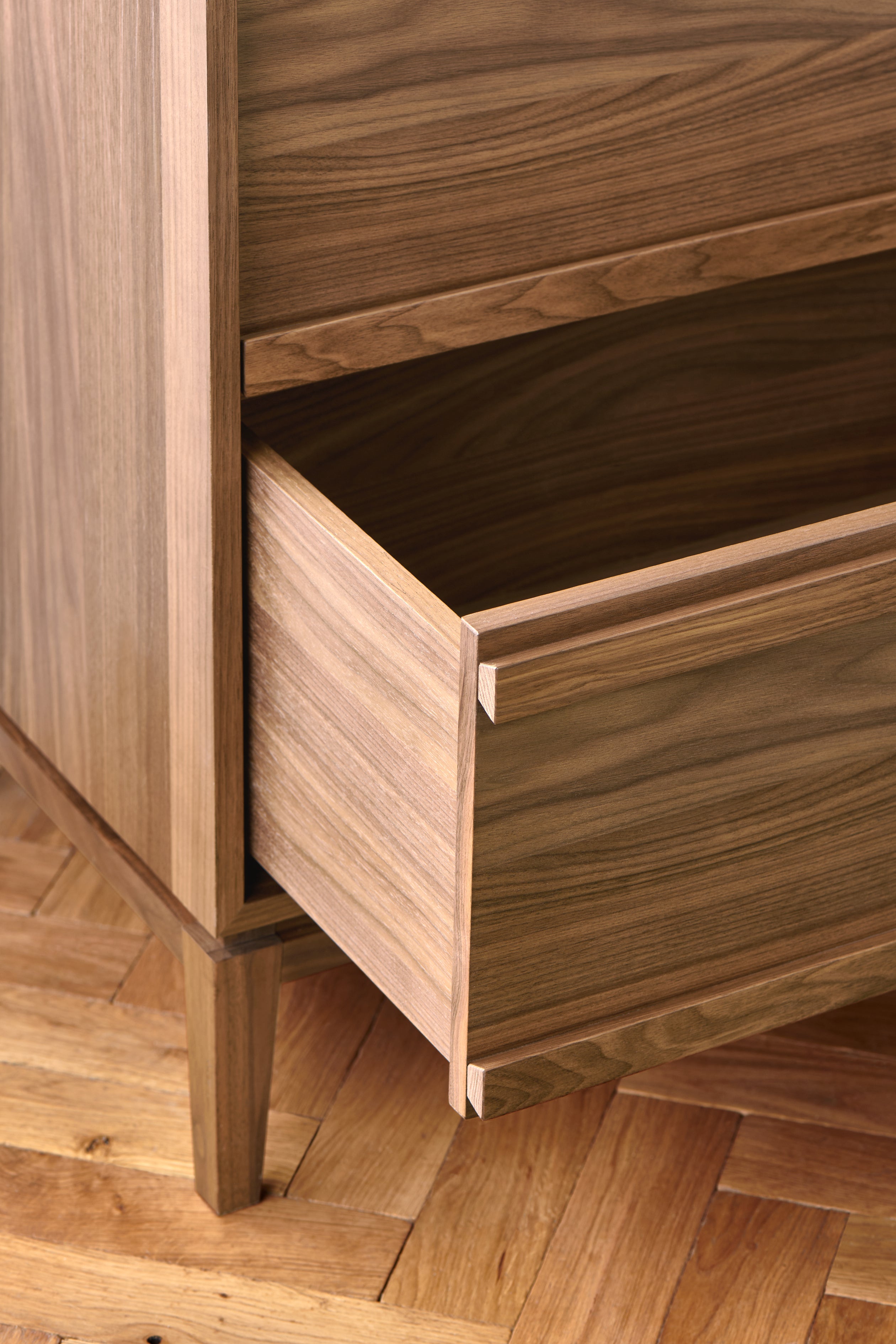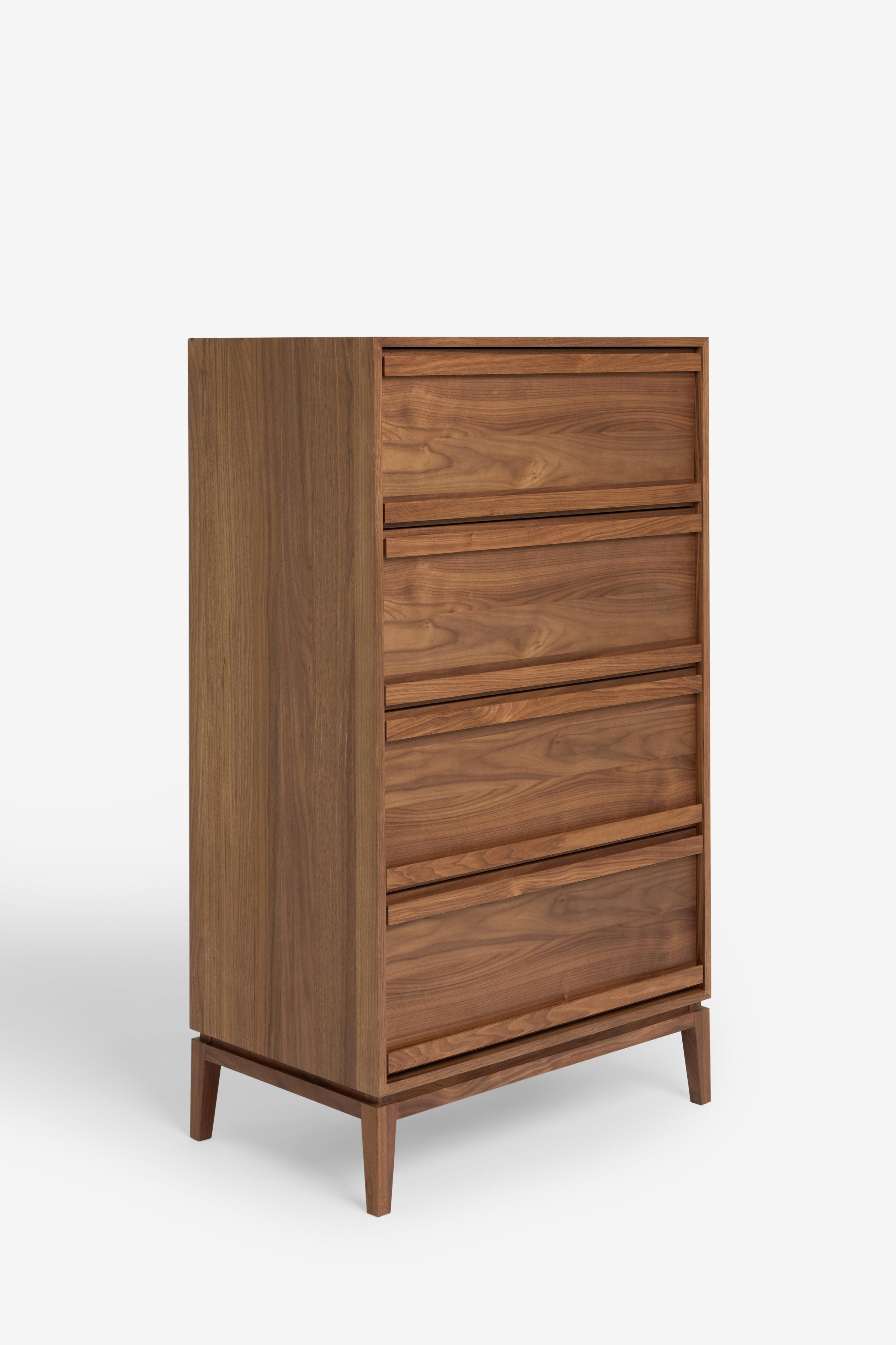 Made from solid walnut and walnut veneer on an elevated, slender frame this chest features 4 soft close drawers and arrives fully assembled.
