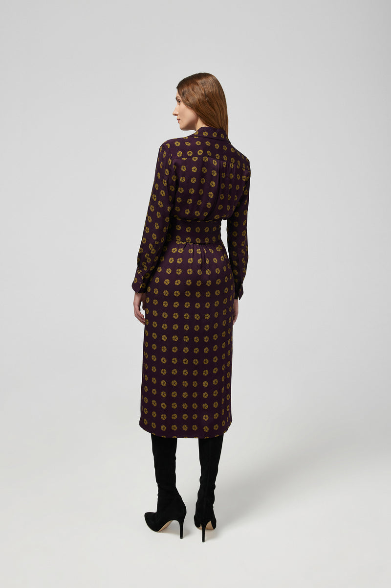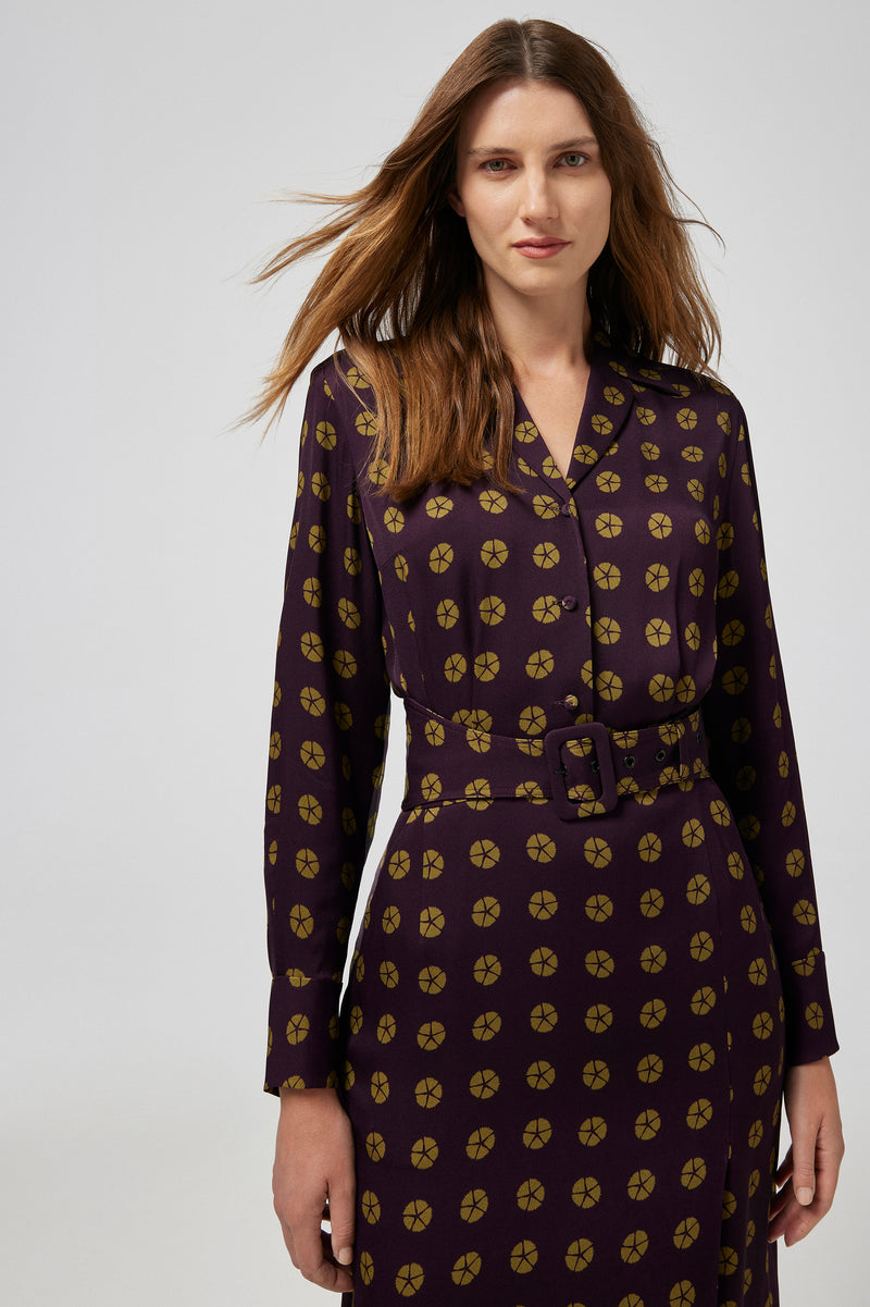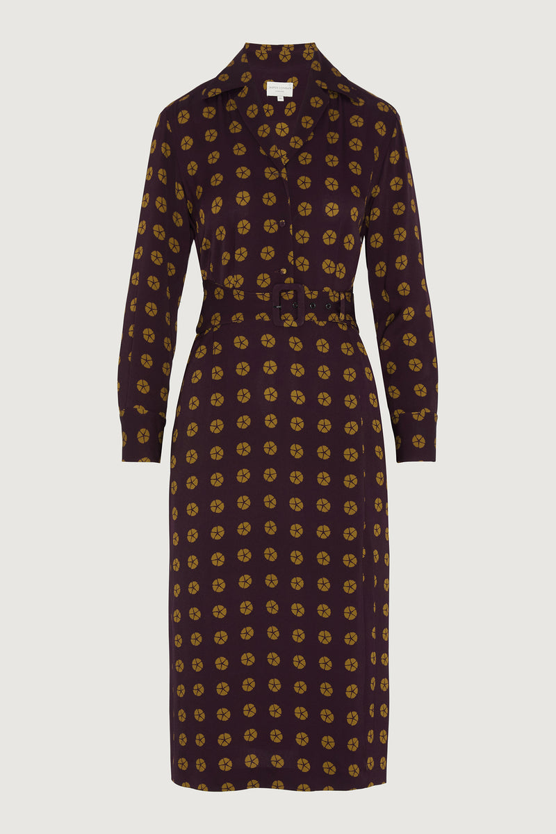 A stylish crepe dress beautifully constructed in a viscose crepe fabric. Featuring a revere collar and button fastening bodice and a removable belt. Designed to fall mid calf, elegantly completed with a wrap split detail to the front side of the skirt.
