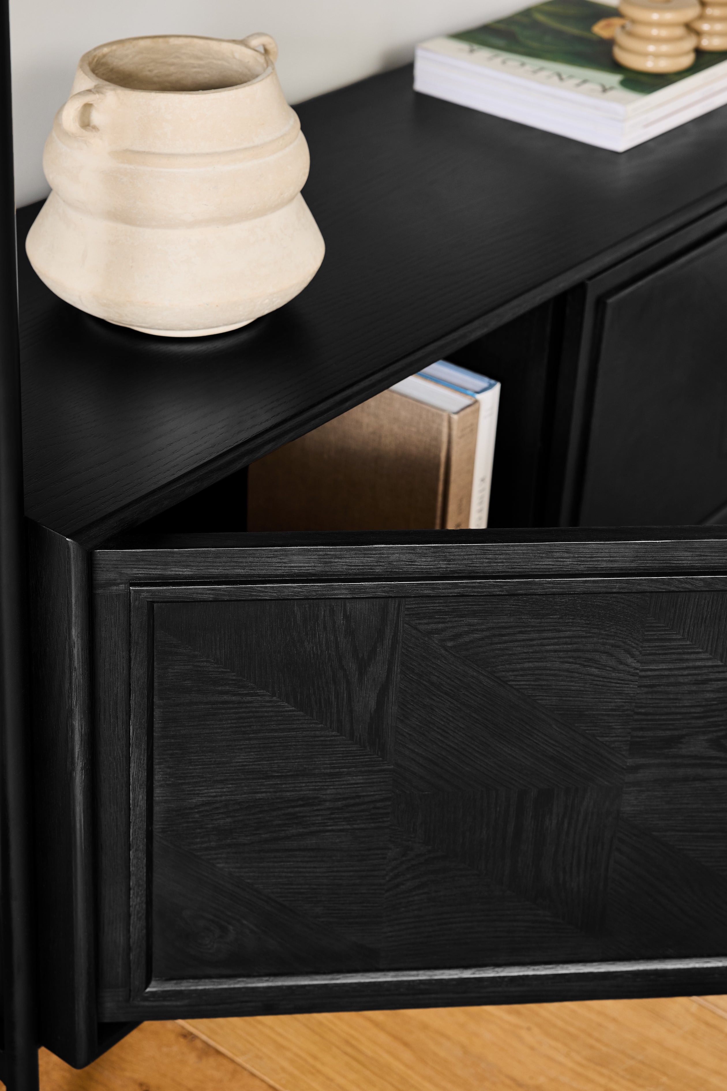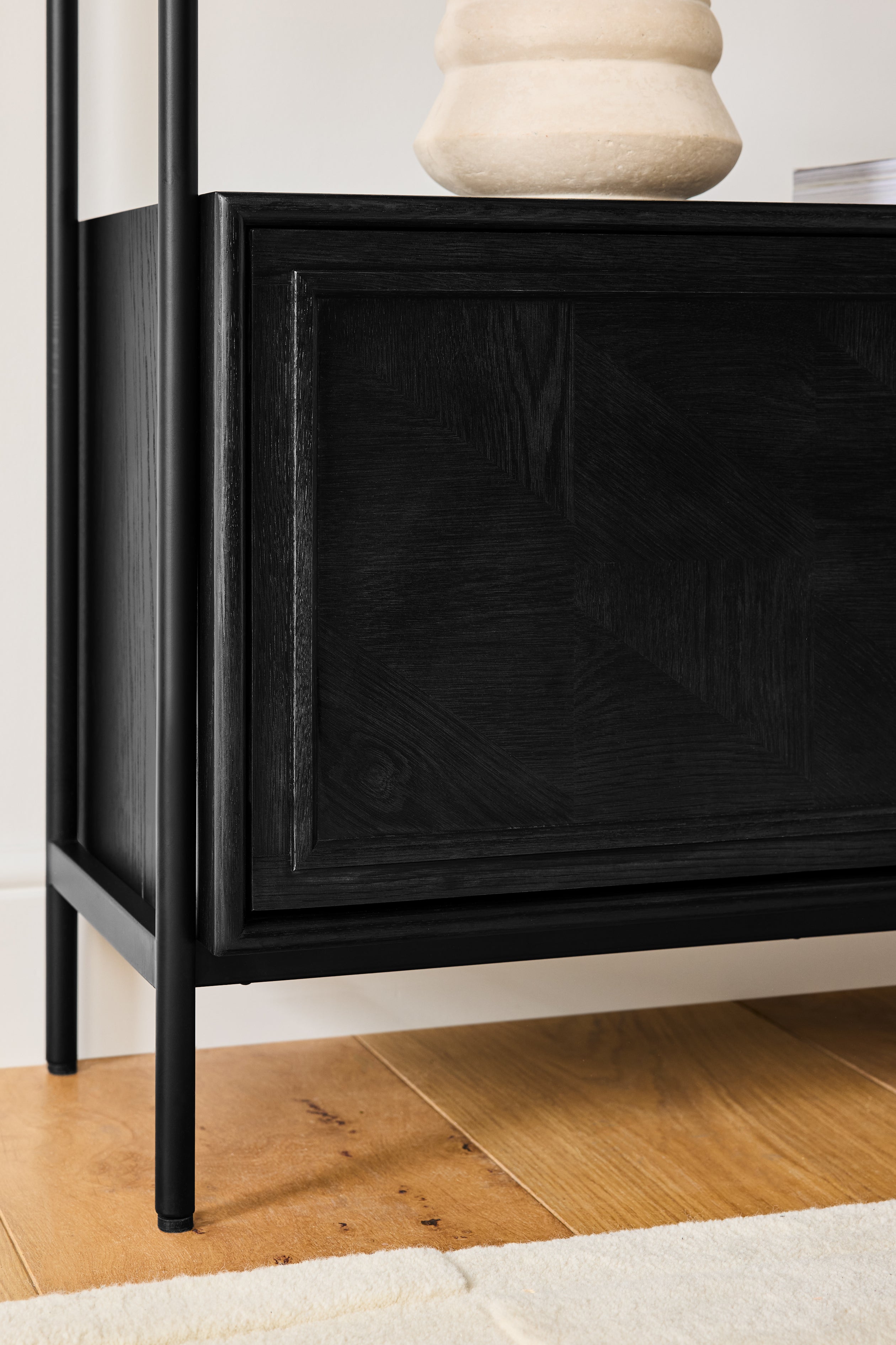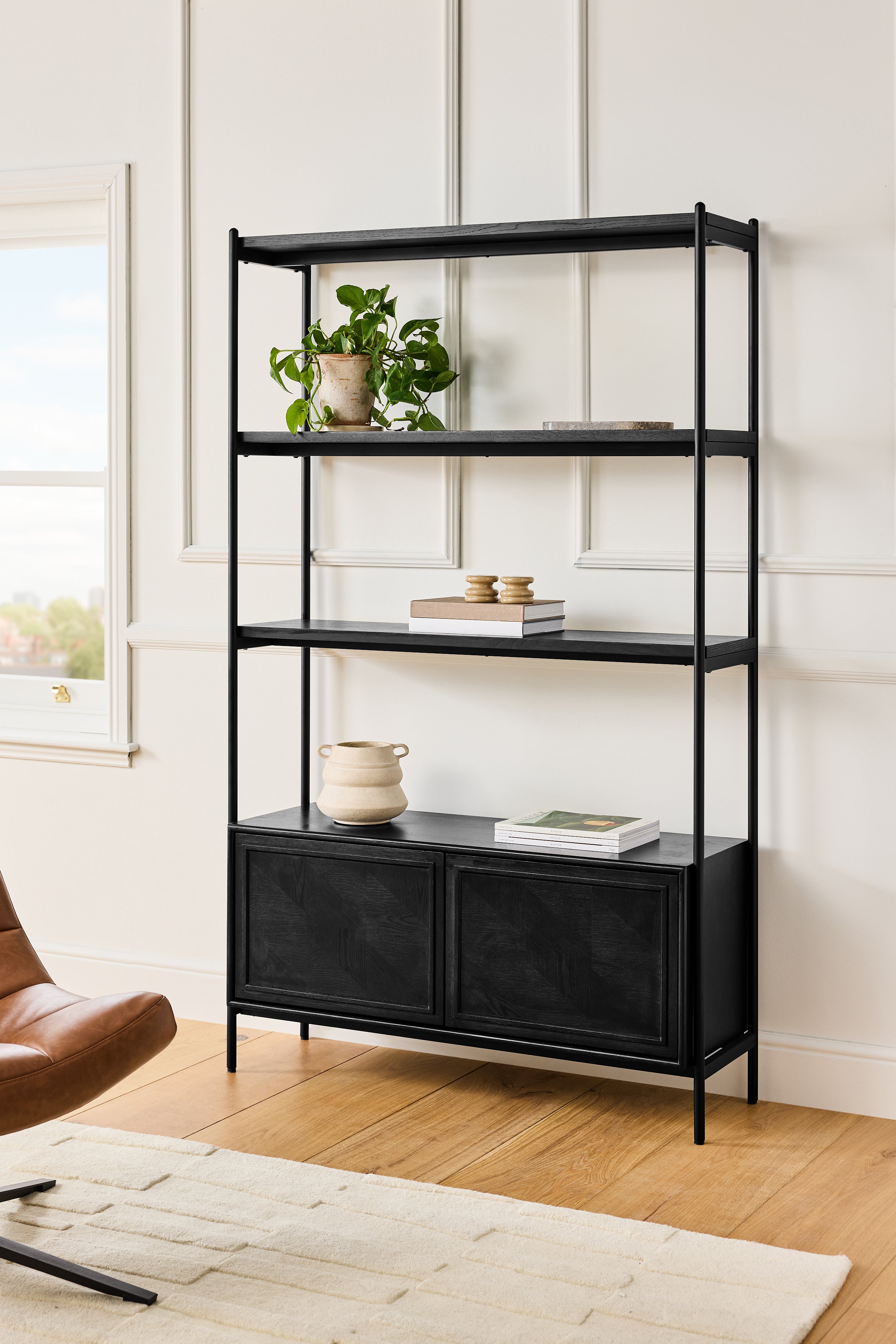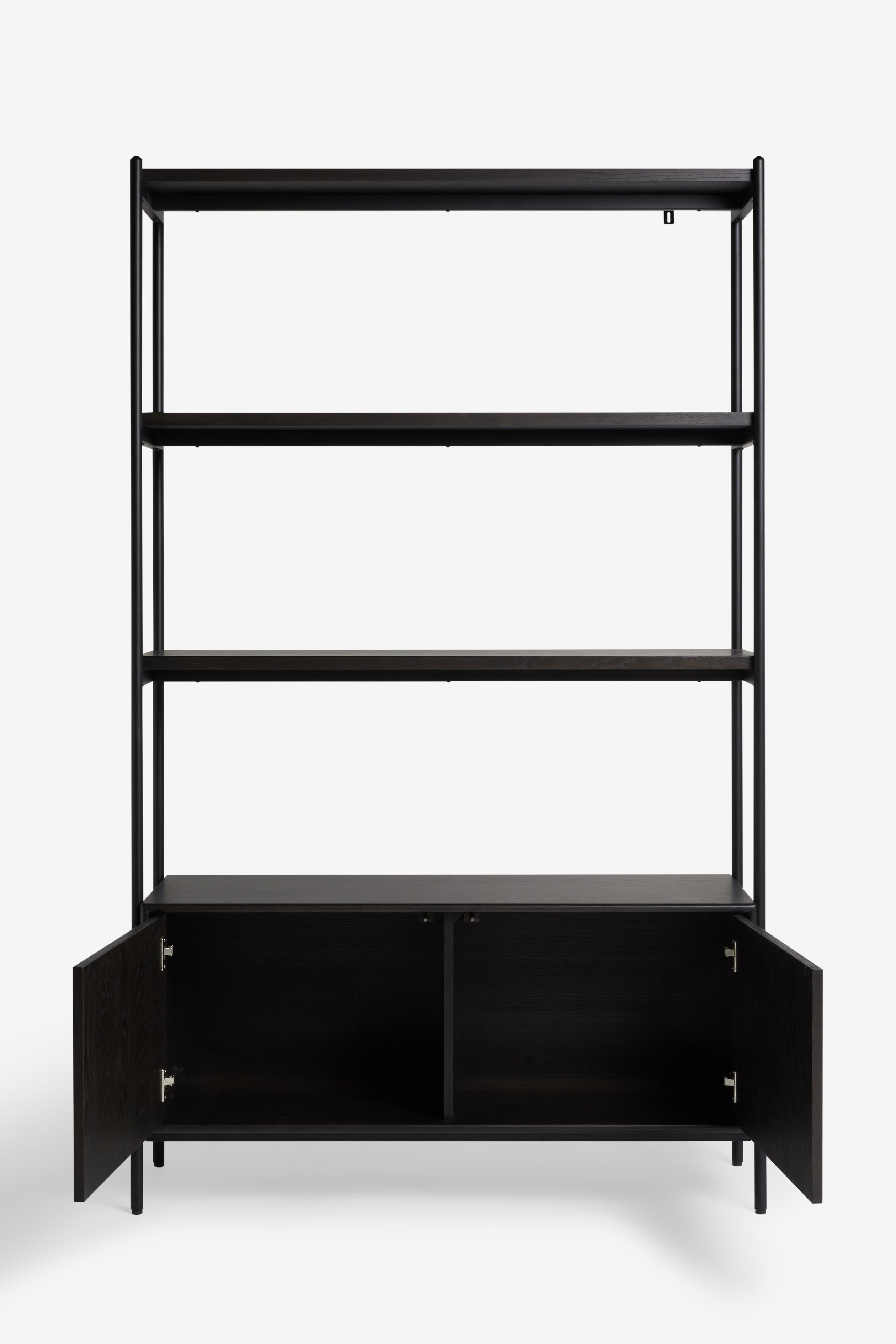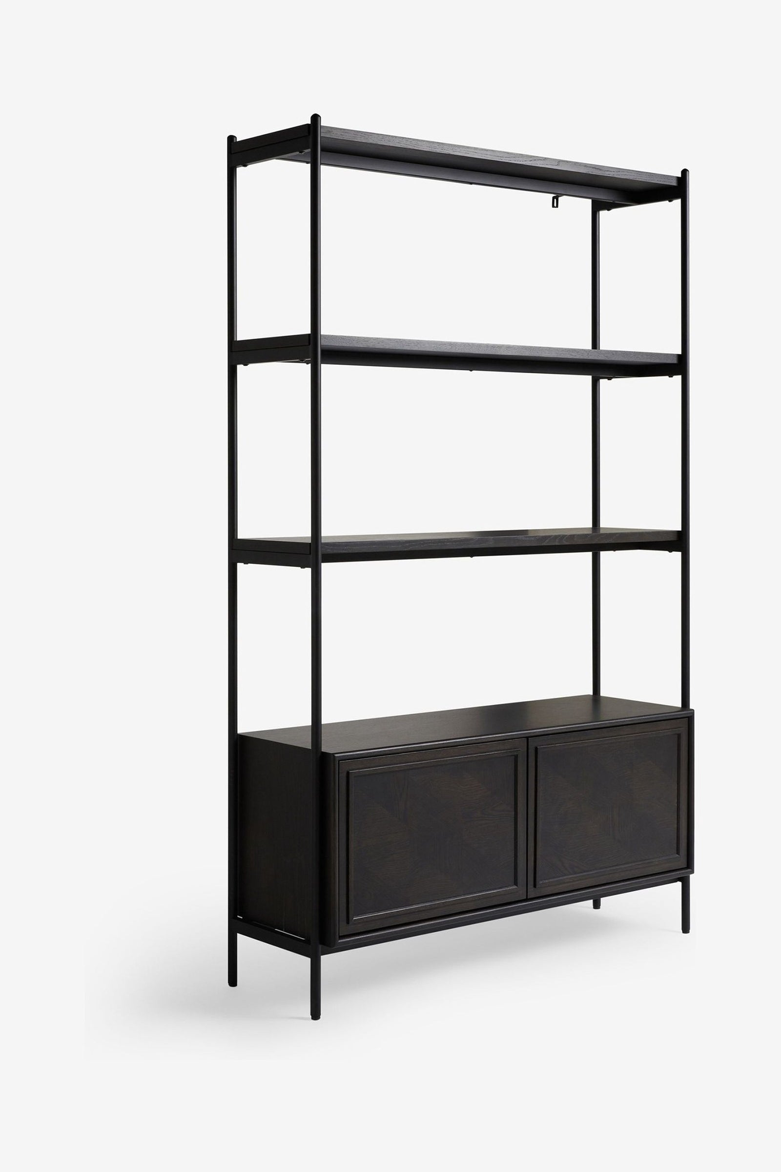 The Dark Oak Aden Shelving Unit combines rich, dark oak wood with sleek metal accents, creating a refined and durable storage solution. Perfect for adding both style and practicality to your home or office.