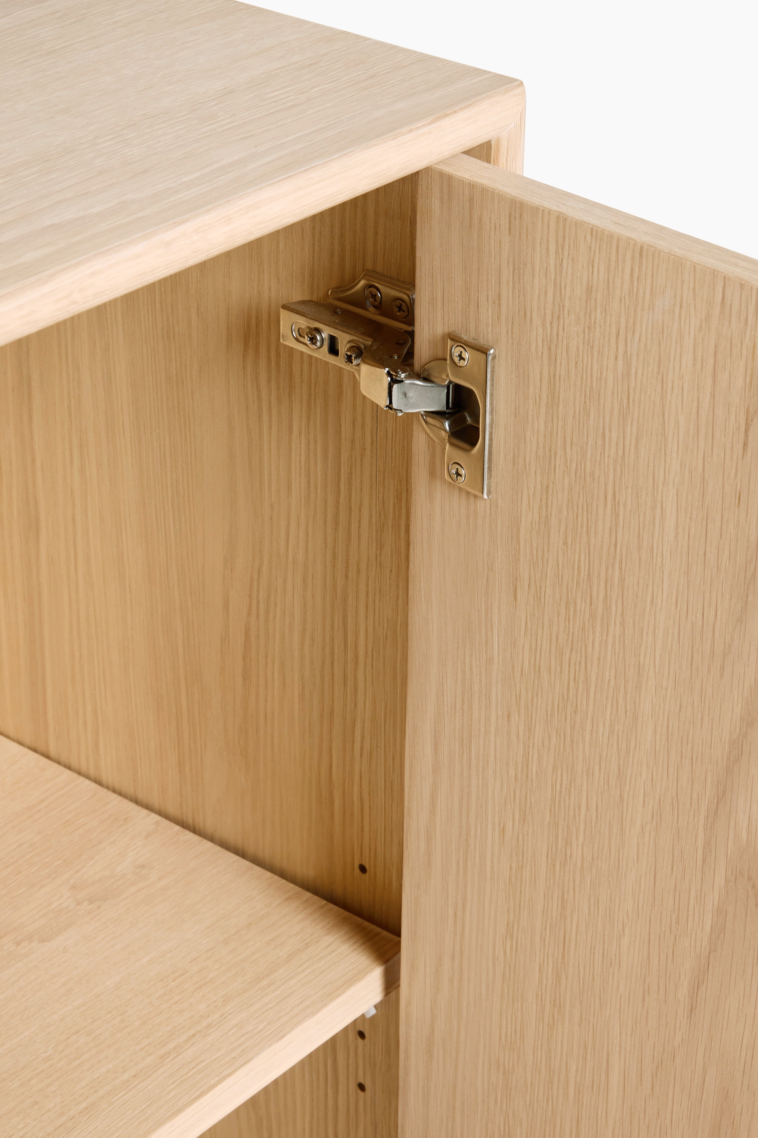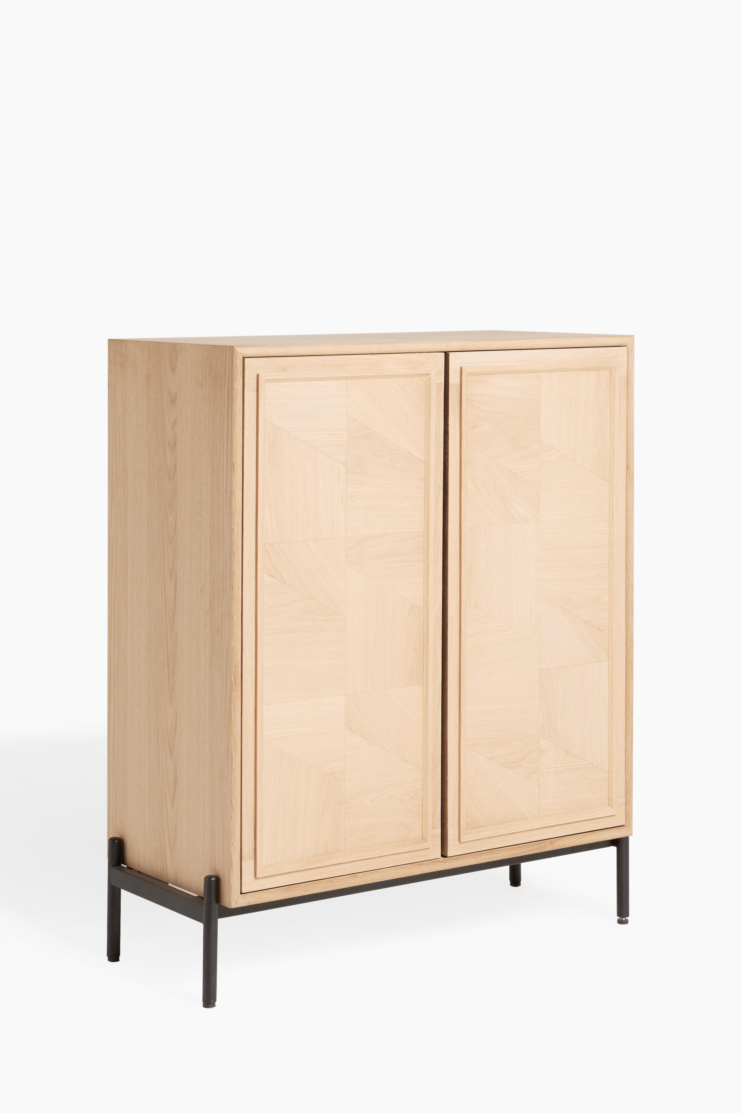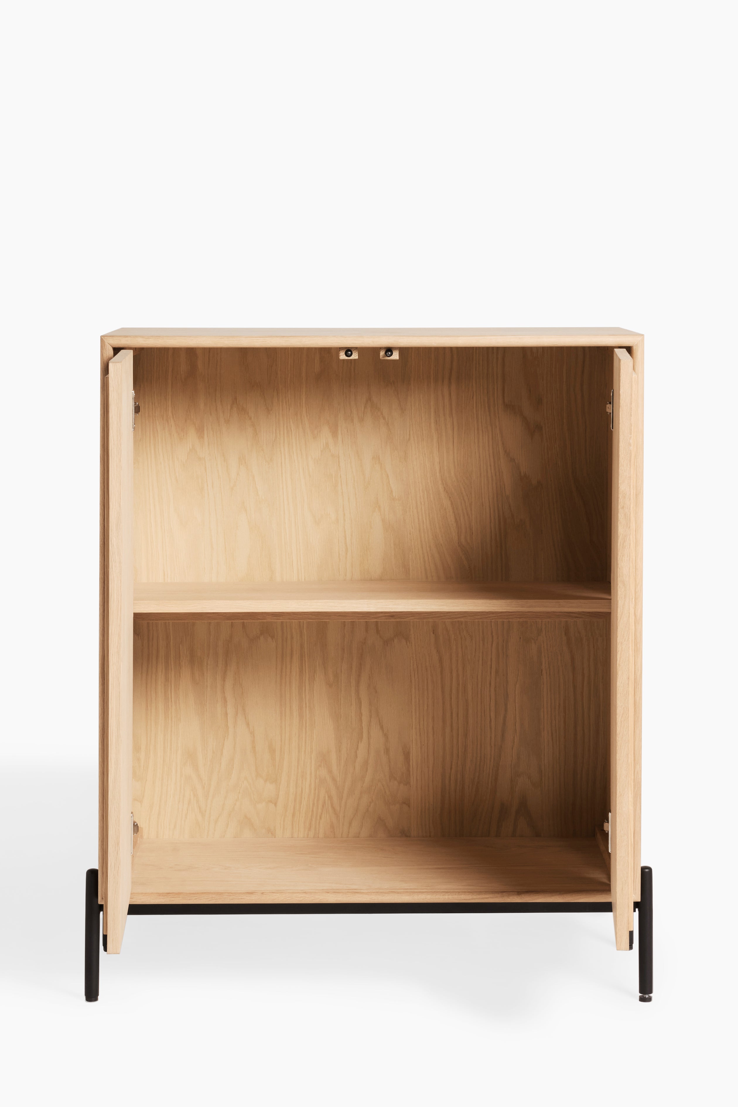 The clean lines and sleek silhouette are enhanced by a striking black metal frame, providing a contemporary contrast to the neutral white washed oak finish. The Aden sideboard boasts a push-to-open function, ensuring a seamless and handle-free aesthetic. Complete your interior design vision by exploring the rest of the Aden collection, also available in a beautiful dark oak finish, allowing you to curate a cohesive and stylish home.