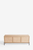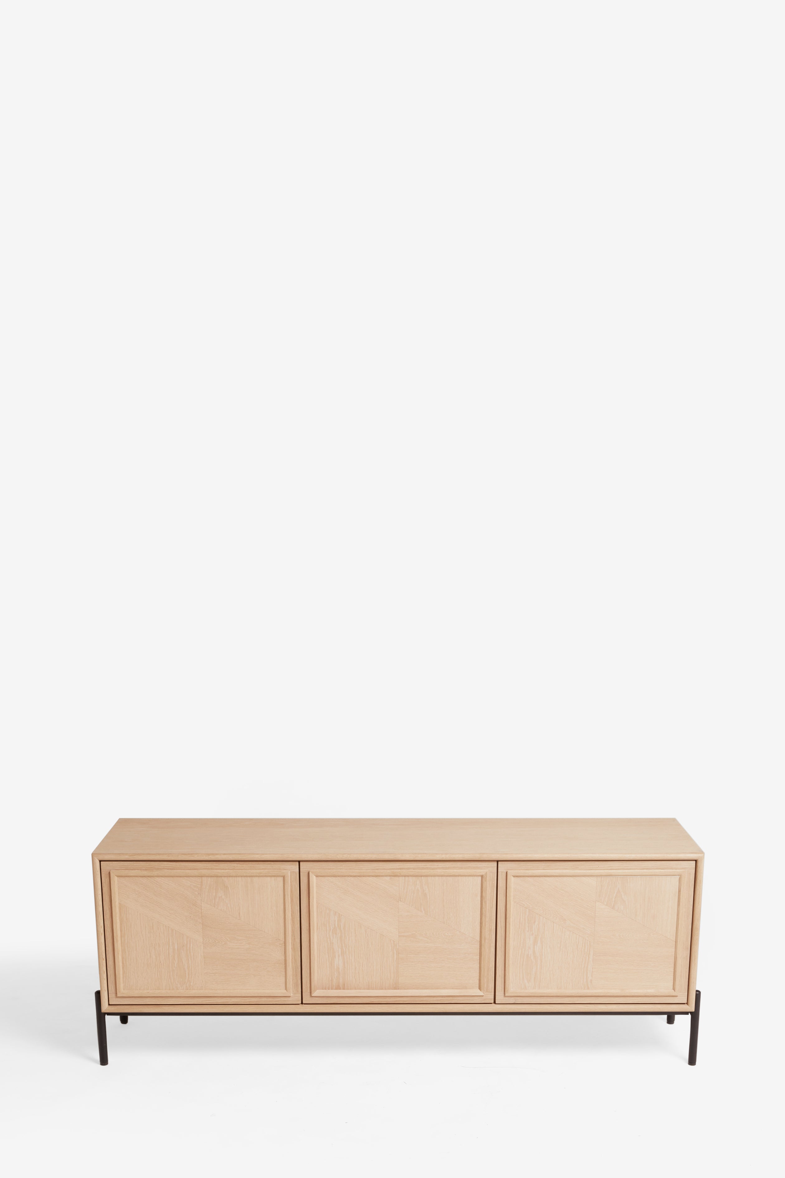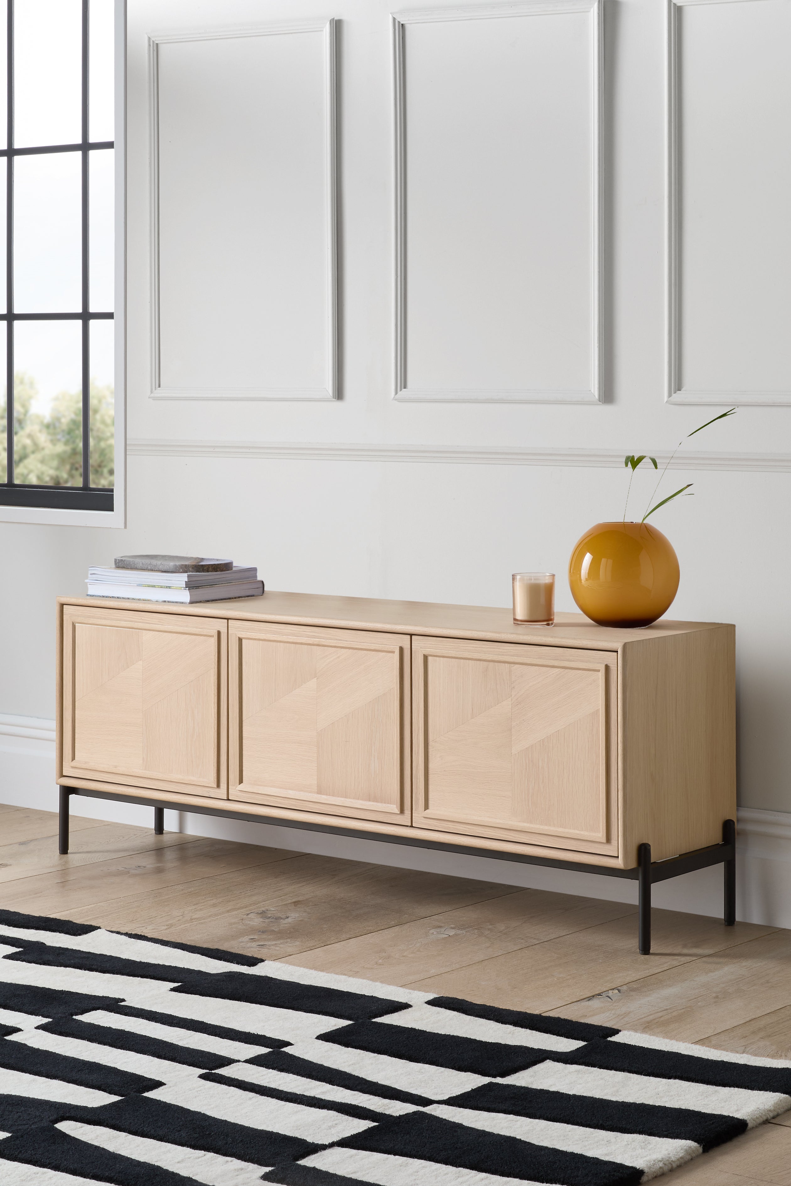 The Jasper Conran London white washed oak Aden wide TV unit, seamlessly blends sophisticated style with practical functionality. Featuring striking patterned door detailing, adding a unique textural element to your living space, the sleek, clean lines are accentuated by a modern black metal frame, providing a contemporary contrast to the white washed oak finish. Explore the complete Aden range, also available in a stylish dark oak finish, to create a cohesive and stylish entertainment setup.