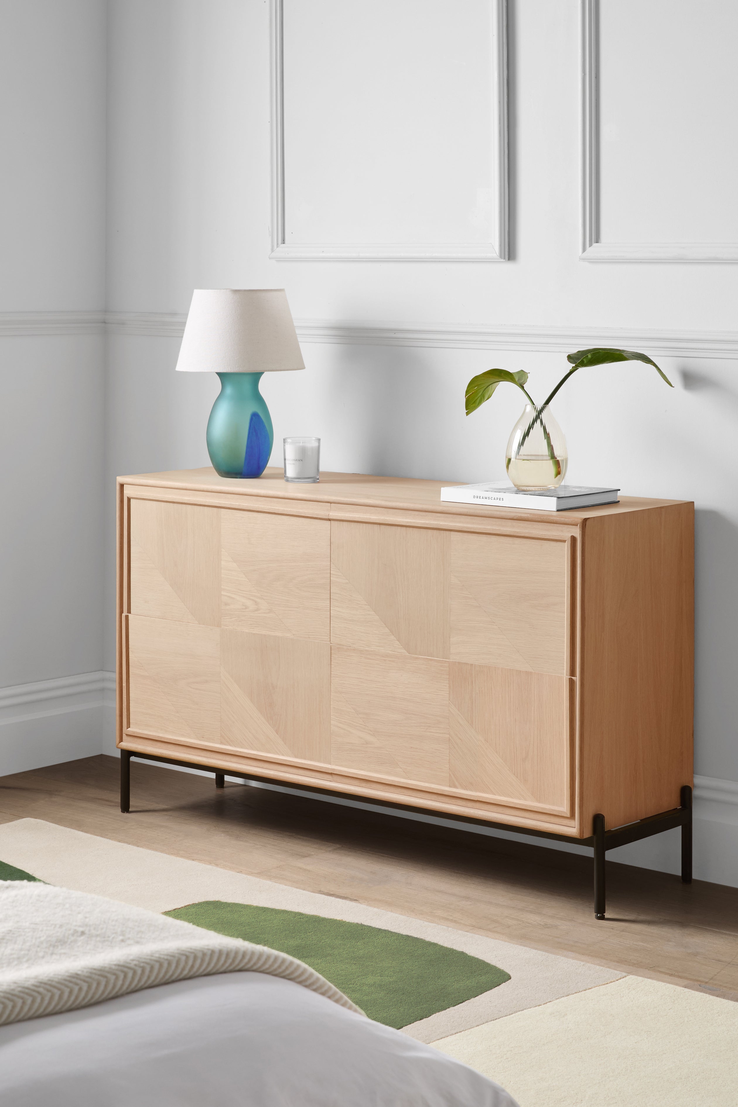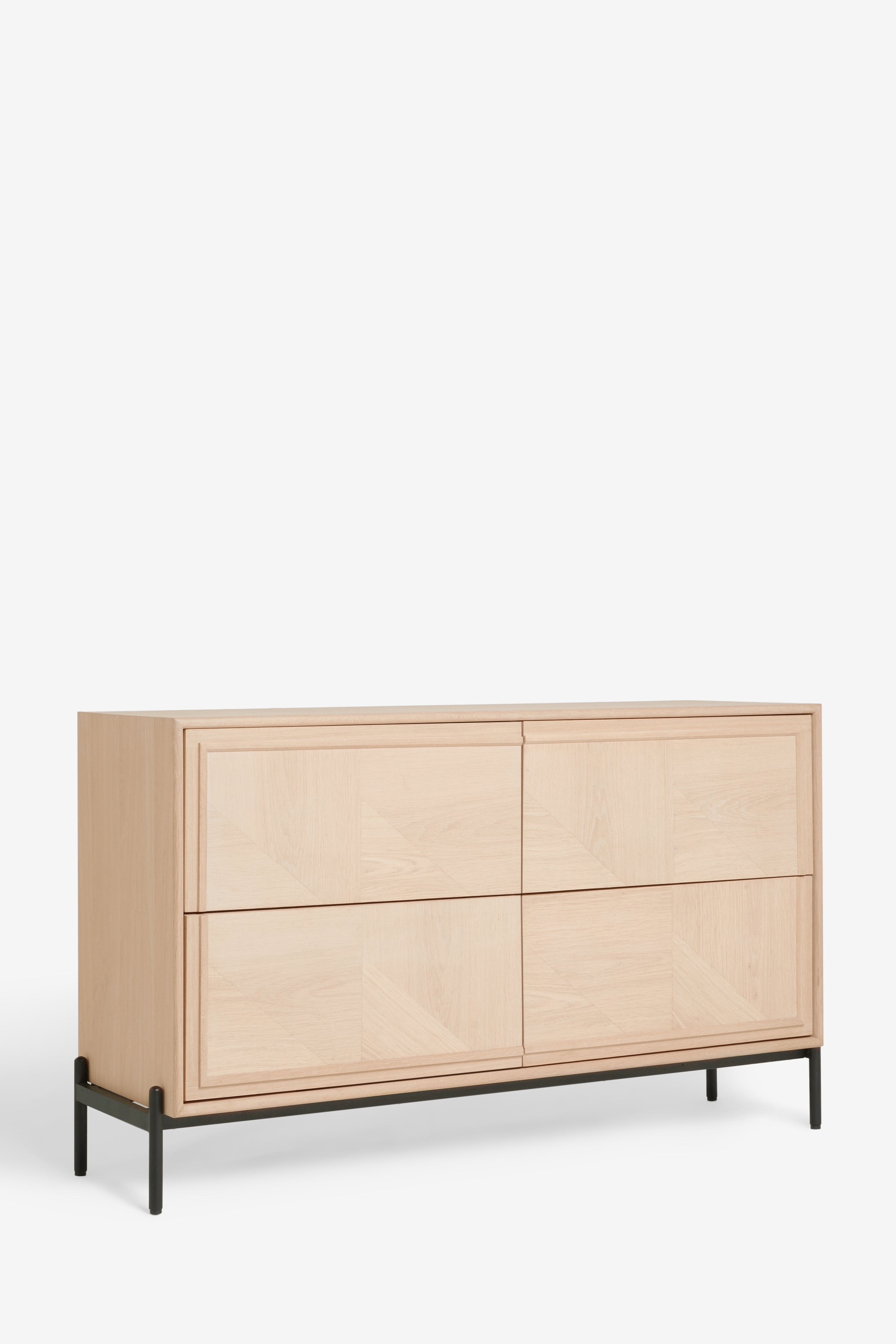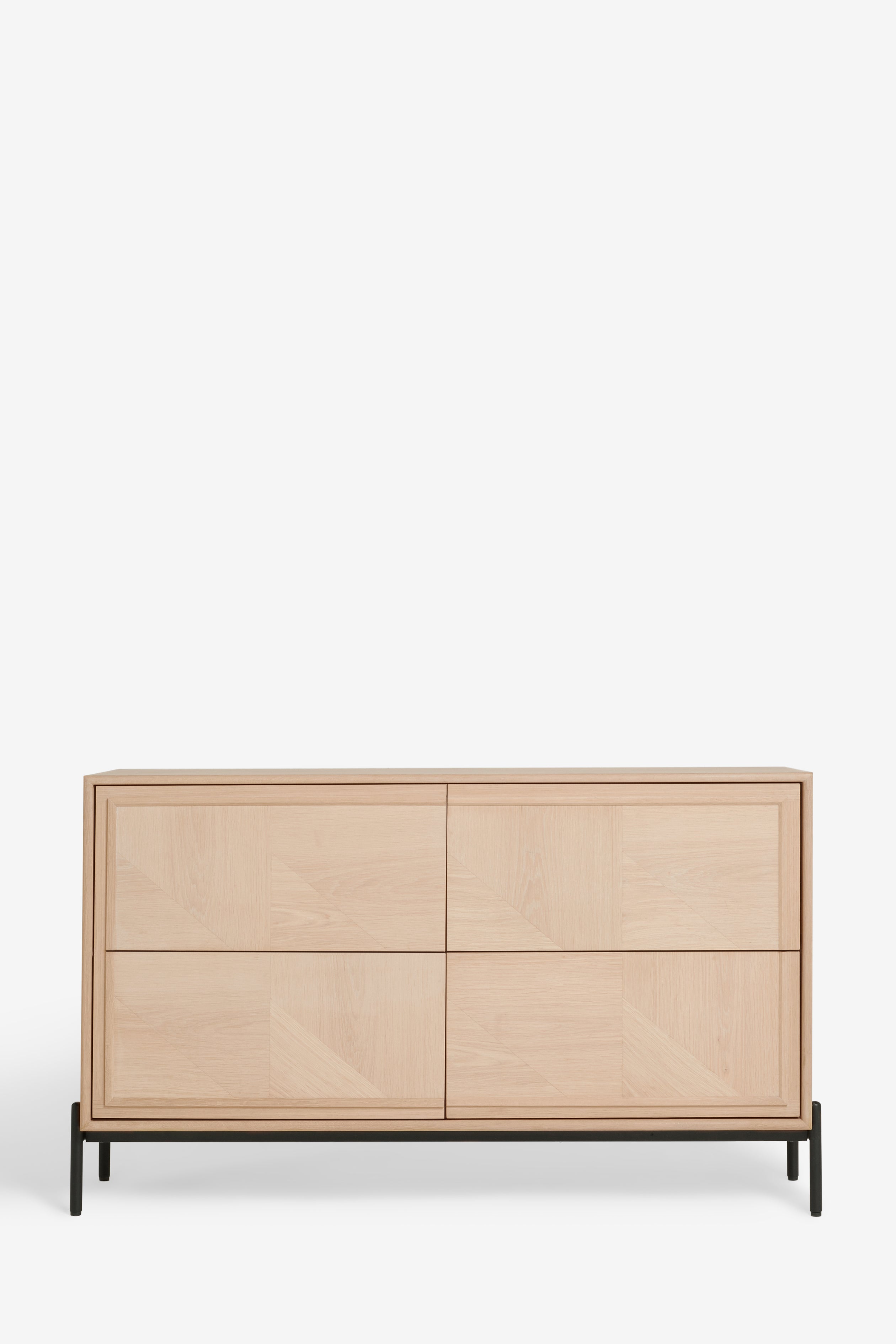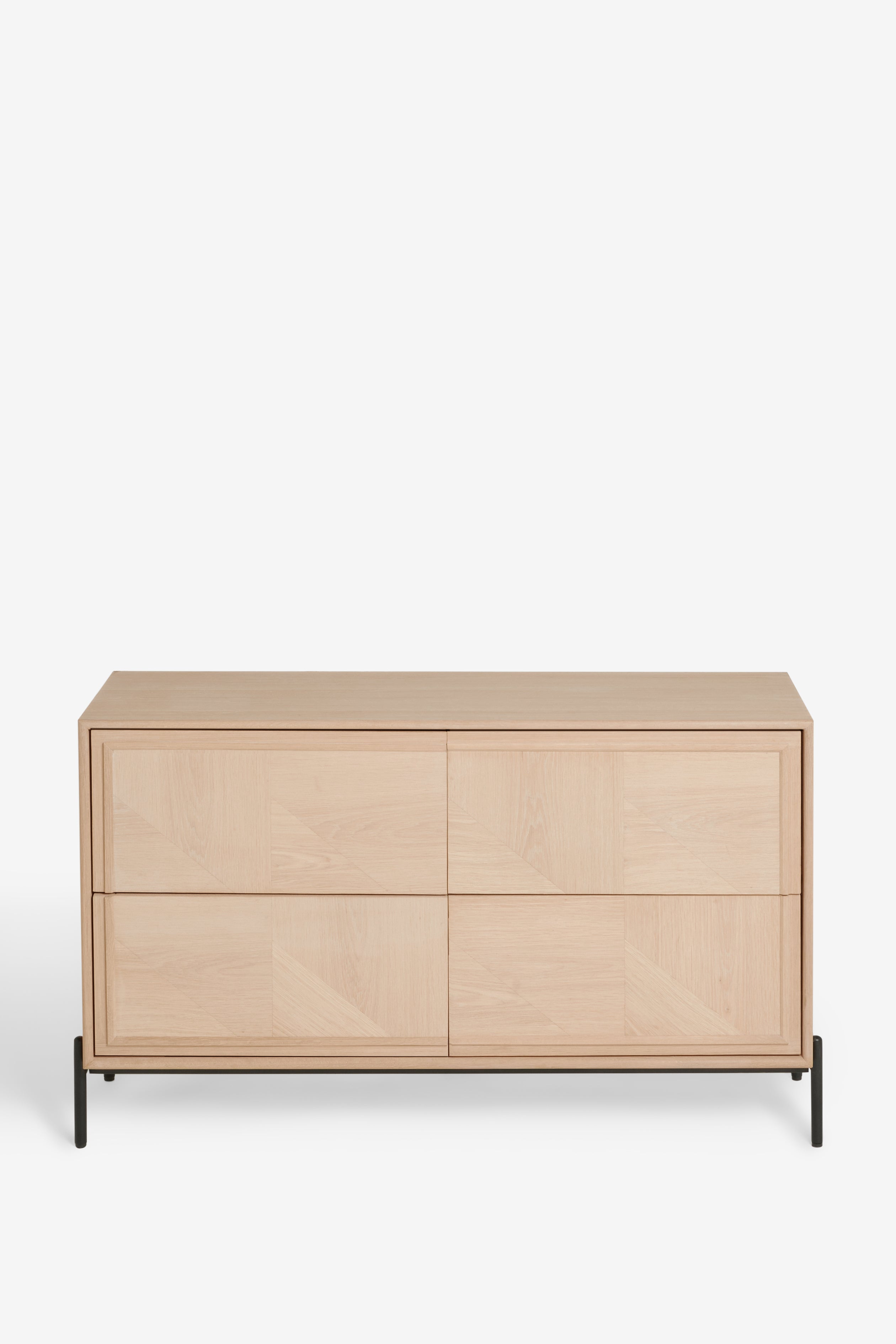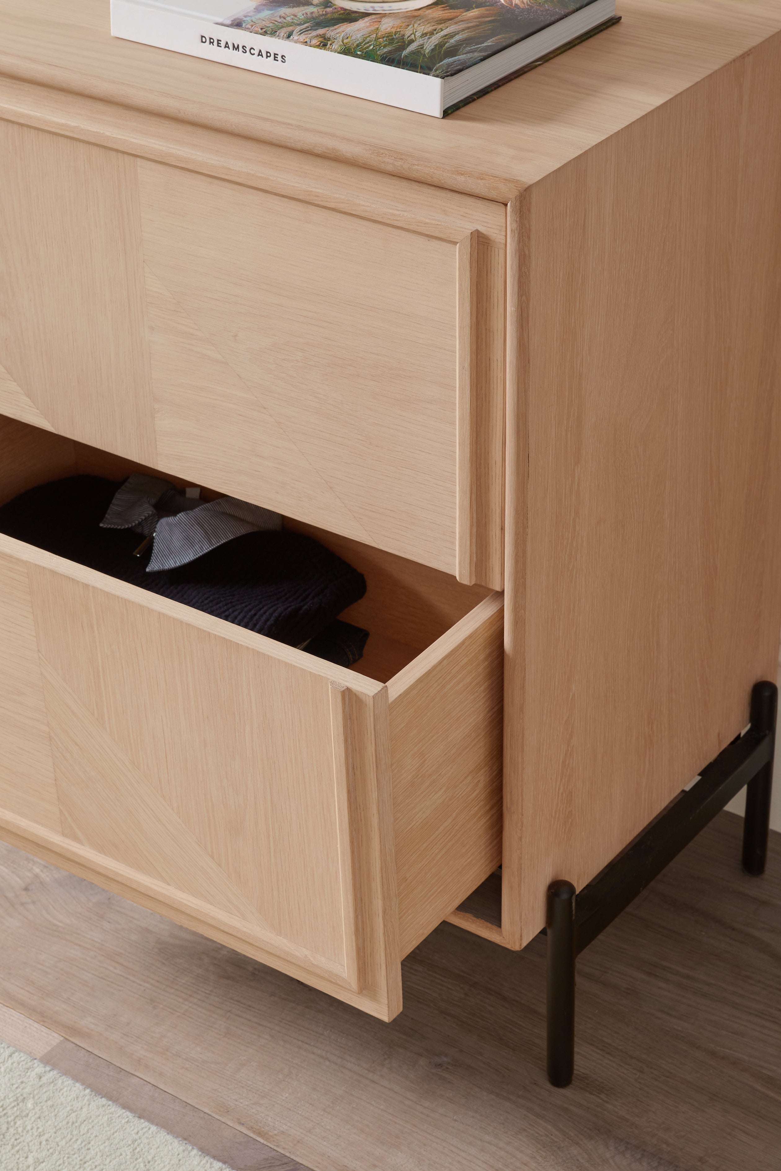 The Aden Whitewashed Oak Chest of Drawers combines understated elegance with practical design. Crafted from whitewashed oak veneer and supported by sleek black metal feet, it offers a refined aesthetic that complements any interior. .