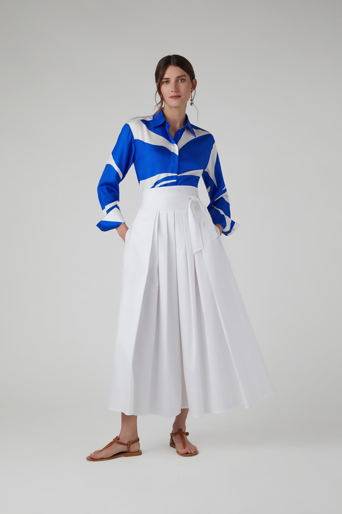 Match the Gail silk twill printed skirt with the coordinating Gail printed shirt for a fashion-forward yet timeless outfit. This pairing is both sophisticated and expressive, perfect for theatre visits, lunches, or upscale travel.